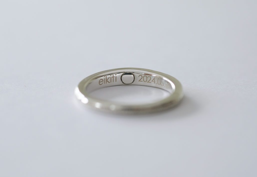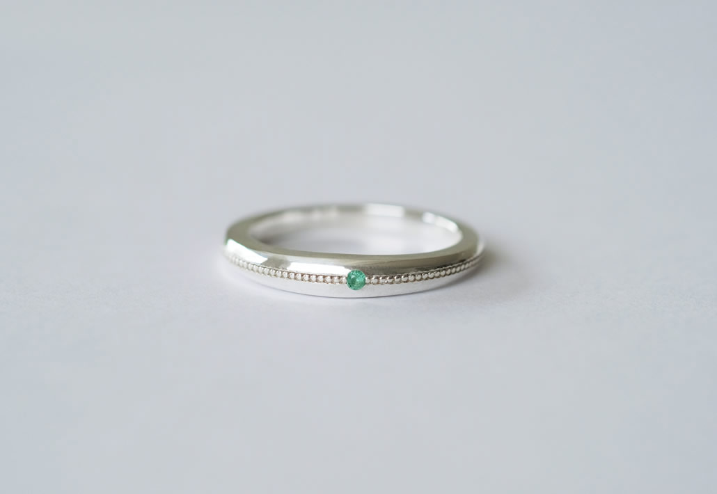 愛犬の一周忌を節目として、メモリアルリングをお作りいたしました。リング内側に納骨し、お名前と命日の刻印を入れさせていただきました。リング正面には命日の5月にちなんで5月の誕生石「エメラルド」を石留しております。