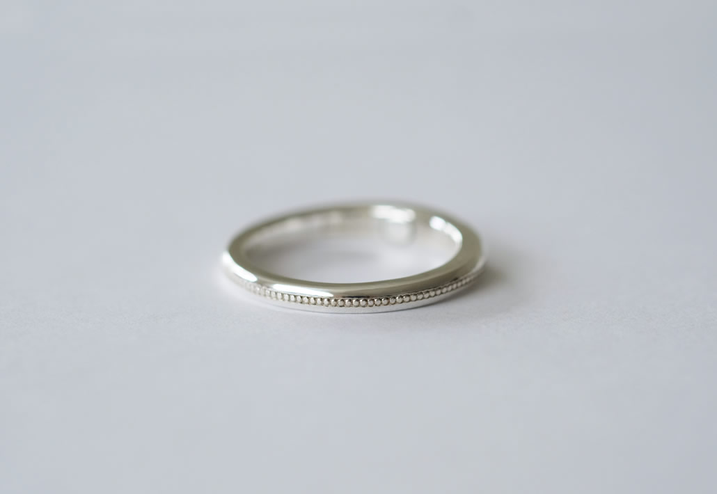 命日の誕生石とミル打ち加工が入ったデザインにて、愛犬のメモリアルリングをシルバーにてお作りさせていただきました。
