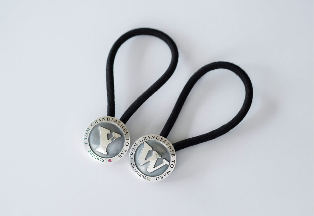 ヘアゴムはコンチョから簡単に外せる構造でお作りしておりますので、古くなってしまっても新しいヘアゴムへの交換が可能です。また、ゴムを外してレザーアイテム等にも縫い付けて愛用することもできますので、大人になっても長くご愛用いただくことができます。