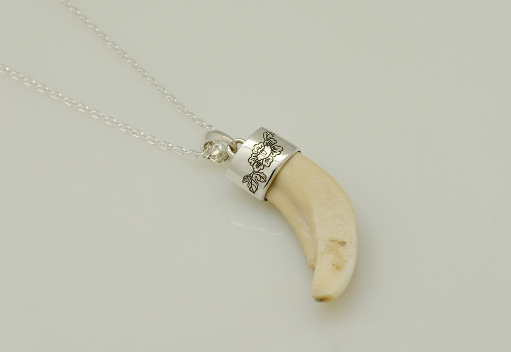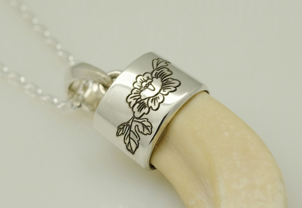 牙には欠けキズがあったので、キズが目立たない向きをご提案させていただきました。SV925(シルバー)のキャップ部分には、牡丹と葉をレーザー彫刻し、チェーンは牙と馴染むようにSV925の4面カットアヅキにし、お洒落でカッコイイペンダントとなりました。