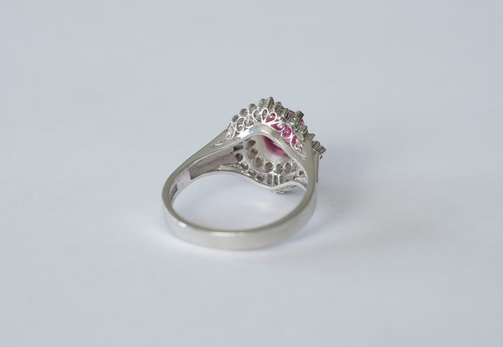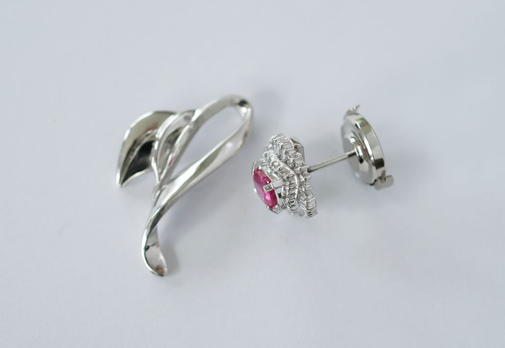 プラチナリングを、ブローチにリフォームしたいということで、ご依頼頂きました。ルビーとメレダイヤの留められた石座をそのままシンプルにタッグピンとして使えるようにお作りしました。また、石座を花に見立て、葉と茎をモチーフとしたデザインの装飾パーツは着脱可能なつくりにし、2WAY使用できるようにいたしました。