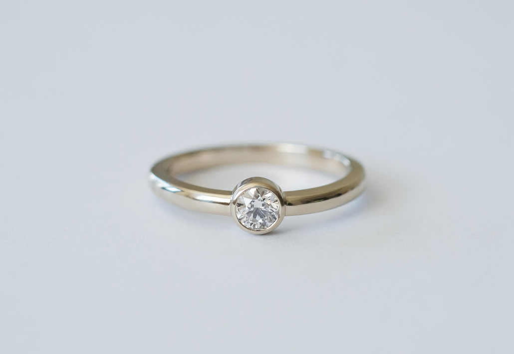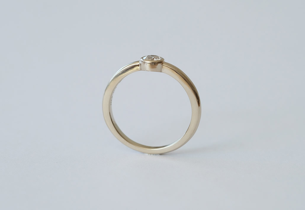 立爪の婚約指輪を、引っかかりの少ないフクリン留めのシャンパンゴールド製のリングへリフォームいたしました。