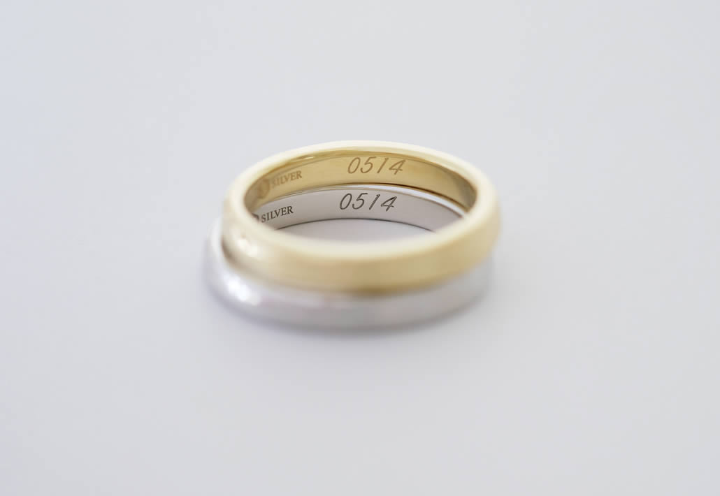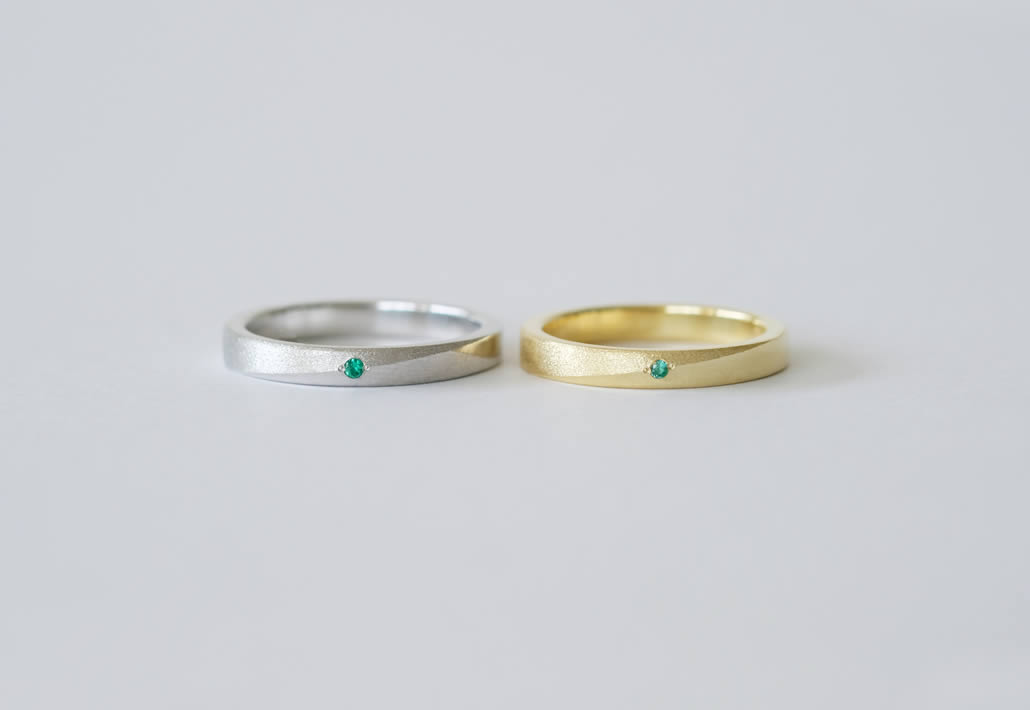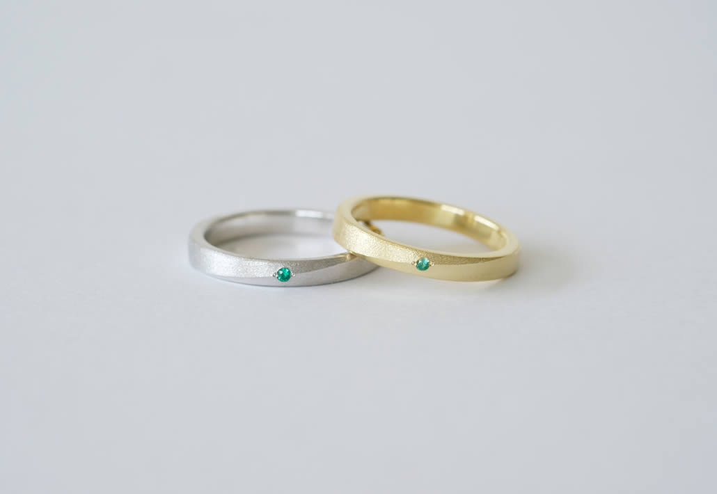 熊本県よりお越しいただいたS様、ペアリングをオーダーしたいということでご来店いただきました。正面にはお二人の記念月である5月の誕生石エメラルドをお留めしております。レディースの方はゴールド色をご希望でしたので、K18イエローゴールドメッキを、メンズの方は色味はそのままにくすみを防ぐためにロジウムメッキを施しました。