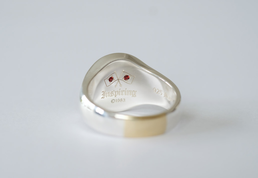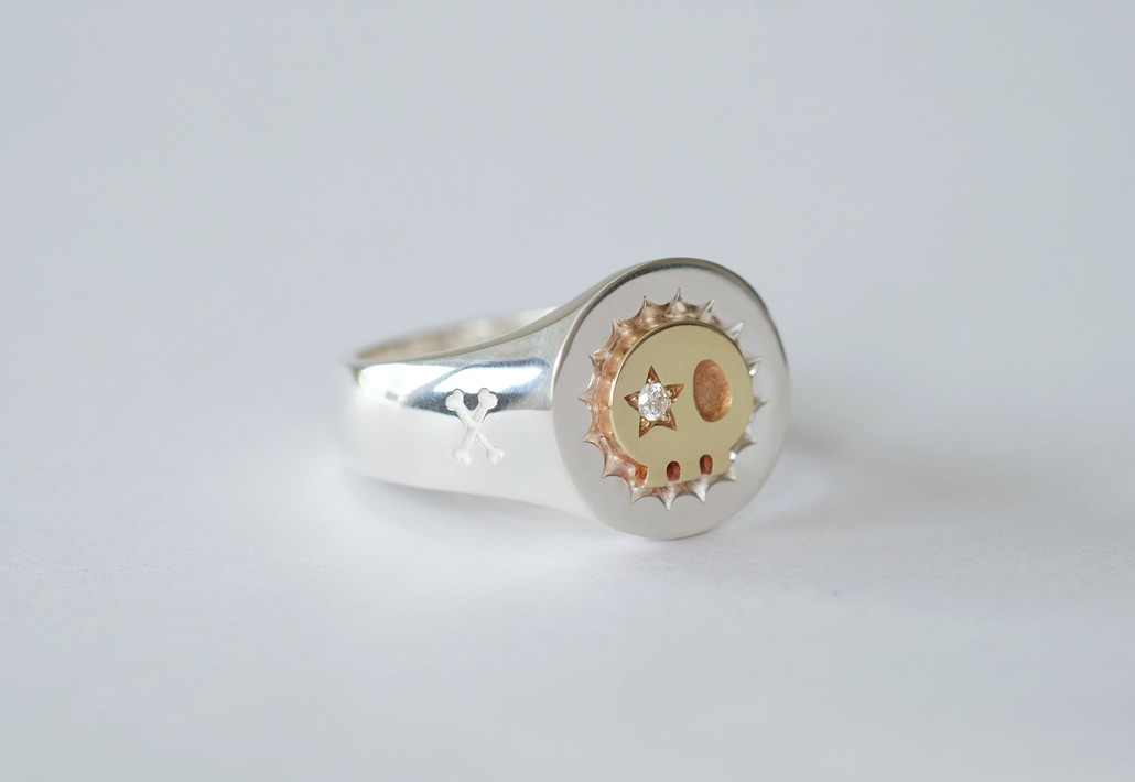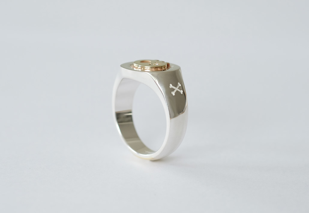 メールオーダーにてご依頼いただいたオリジナルデザインのリングです。シルバー印台リングに真鍮製スカルパーツを組み合わせたコンビリングを制作いたしました。